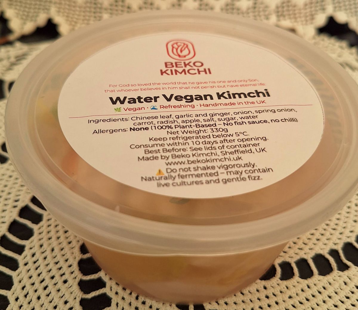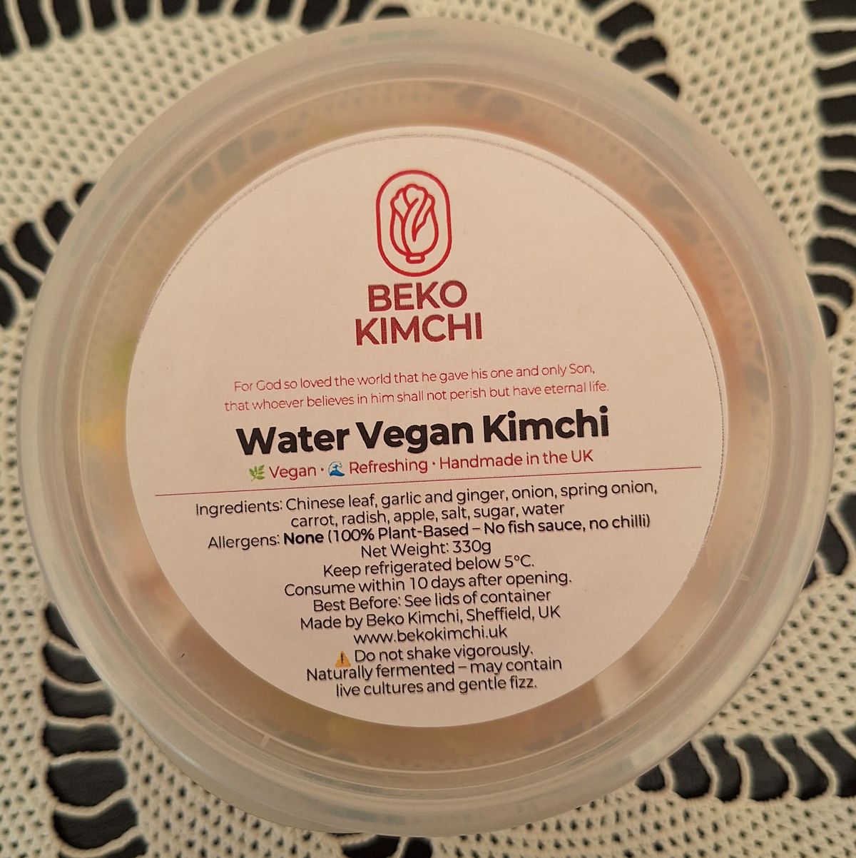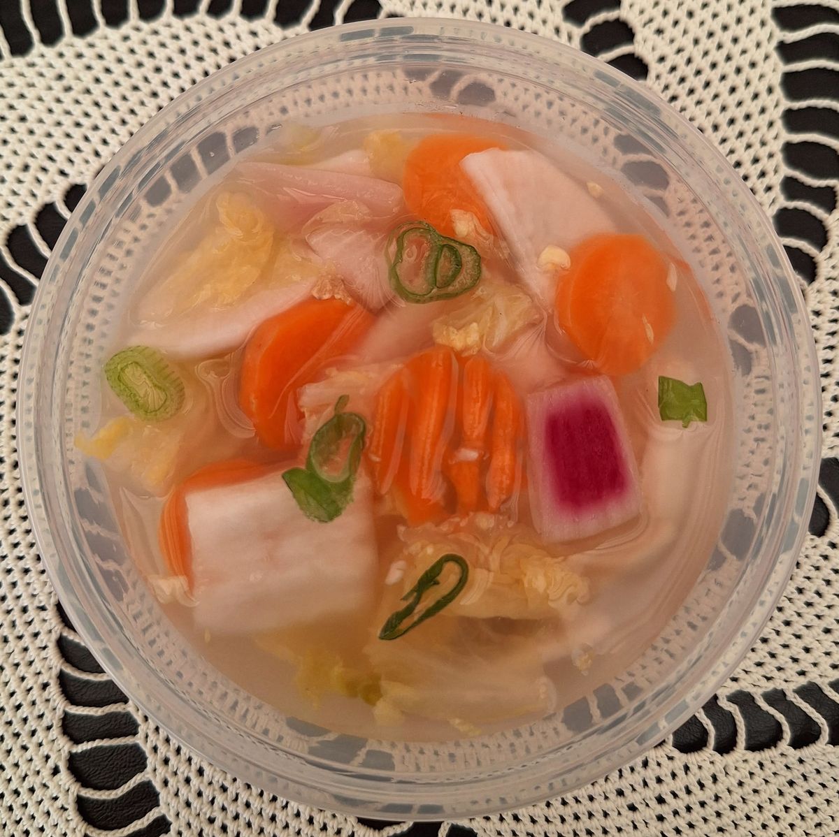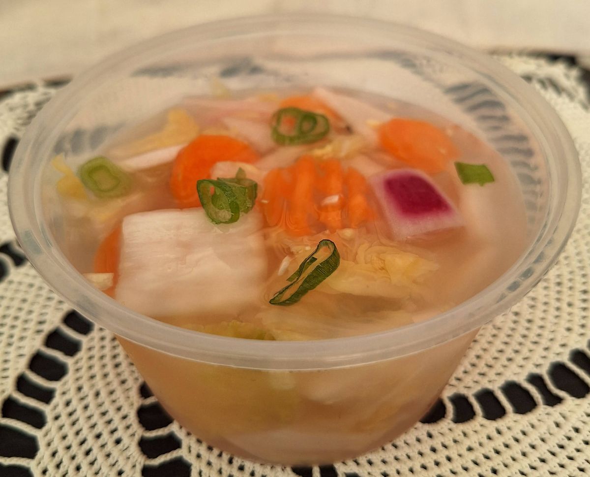 It features crisp chinese leaf, radish, garlic, ginger, and apple — all soaked in a clear, slightly sweet & tangy brine.